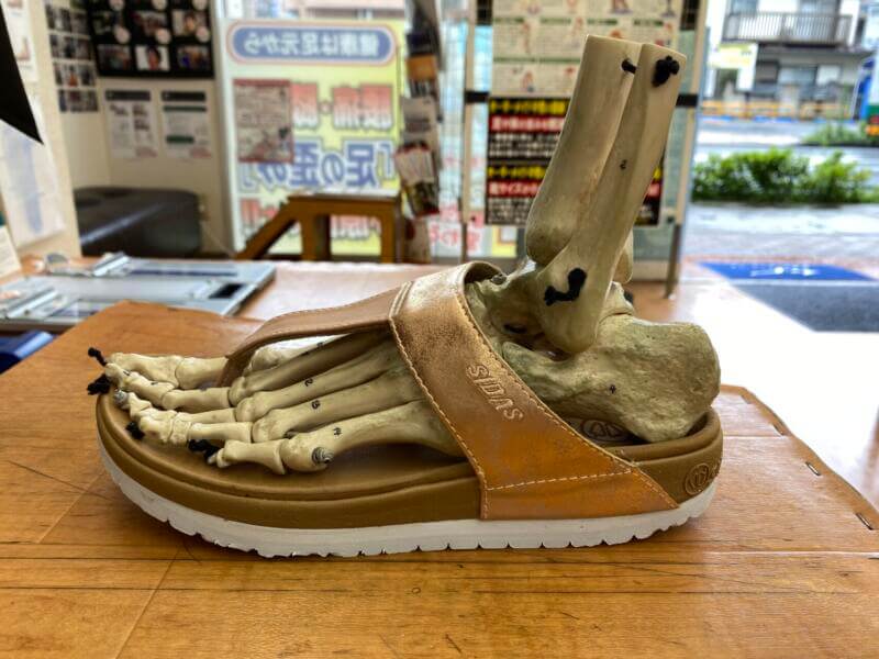 サンダル単体だと分かりづらいので足の模型を履かせてみますね。